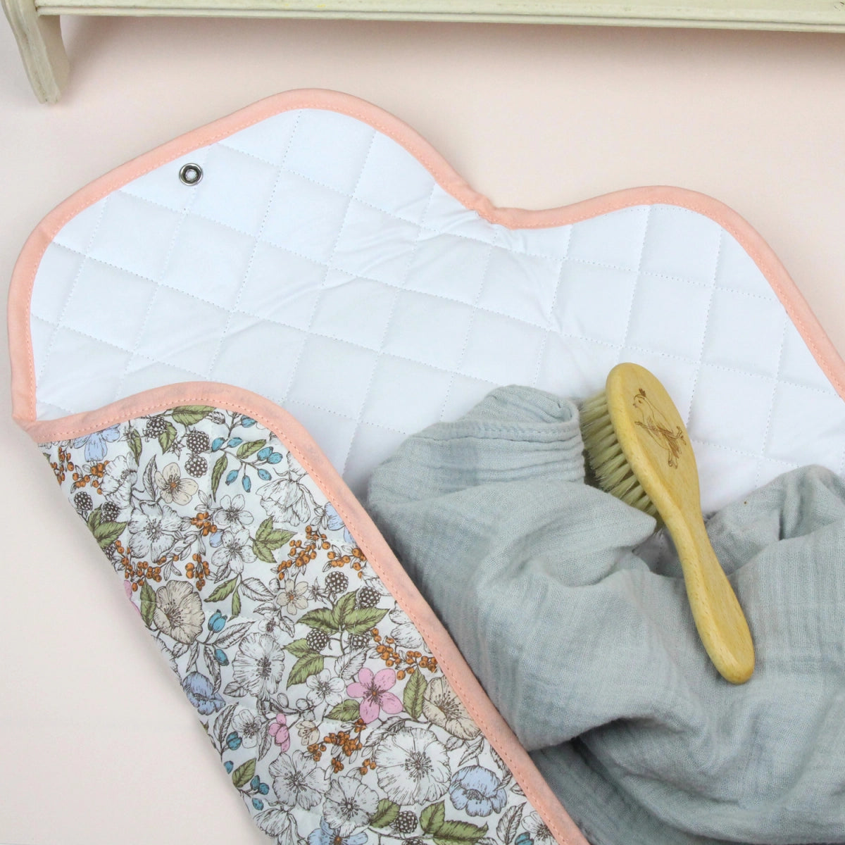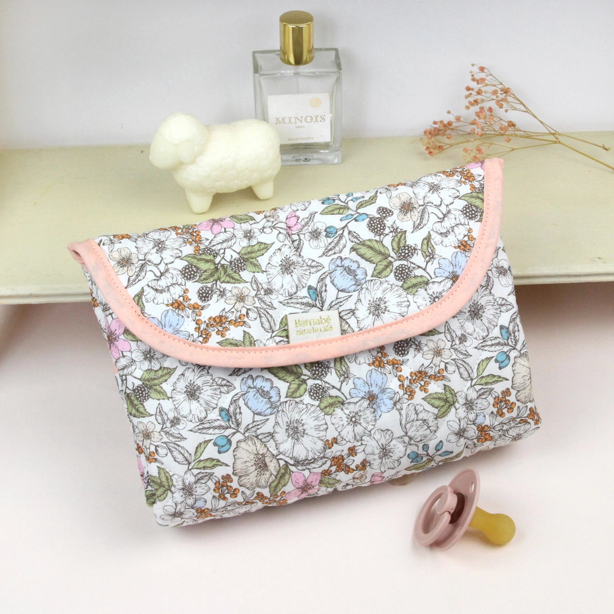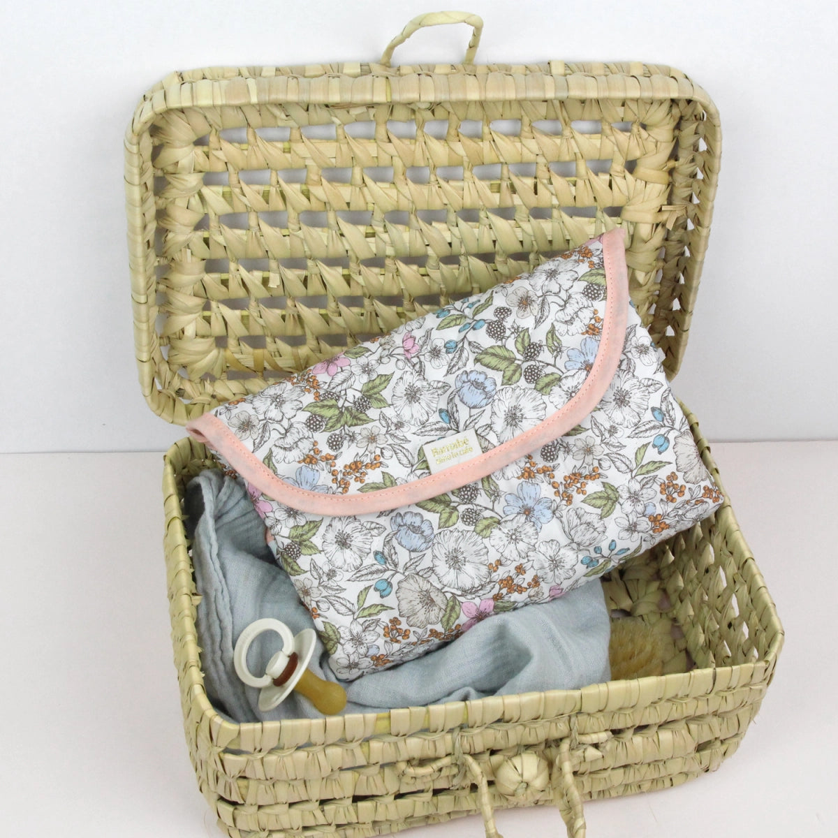Ce tapis de change nomade en tissu Liberty® molletonné, très pratique grâce à son intérieur plastifié.