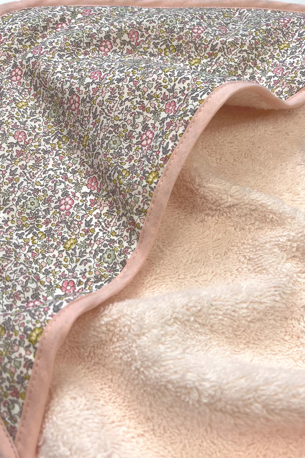 • Composition : éponge : 90% coton et 10% polyester, capuche en tissu Liberty® et biais : 100% coton