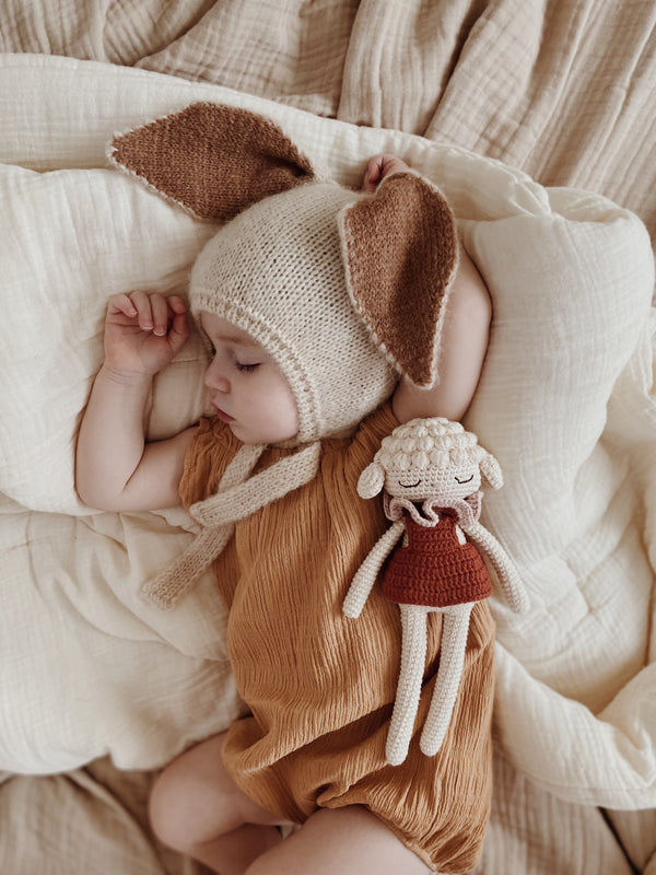 Avec sa silhouette élancée et son regard endormi, cette peluche en crochet incarne la tendresse dans sa forme la plus pure. Entièrement fabriquée à la main à partir de coton biologique certifié GOTS, elle est le fruit du savoir-faire délicat de femmes artisanes en Turquie, imaginée avec soin en Norvège. Chaque pièce est unique, façonnée selon des techniques traditionnelles qui rendent hommage au travail lent et minutieux.