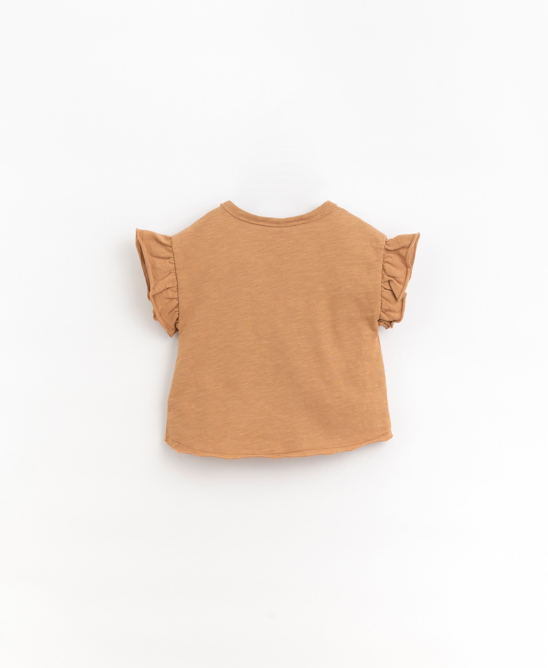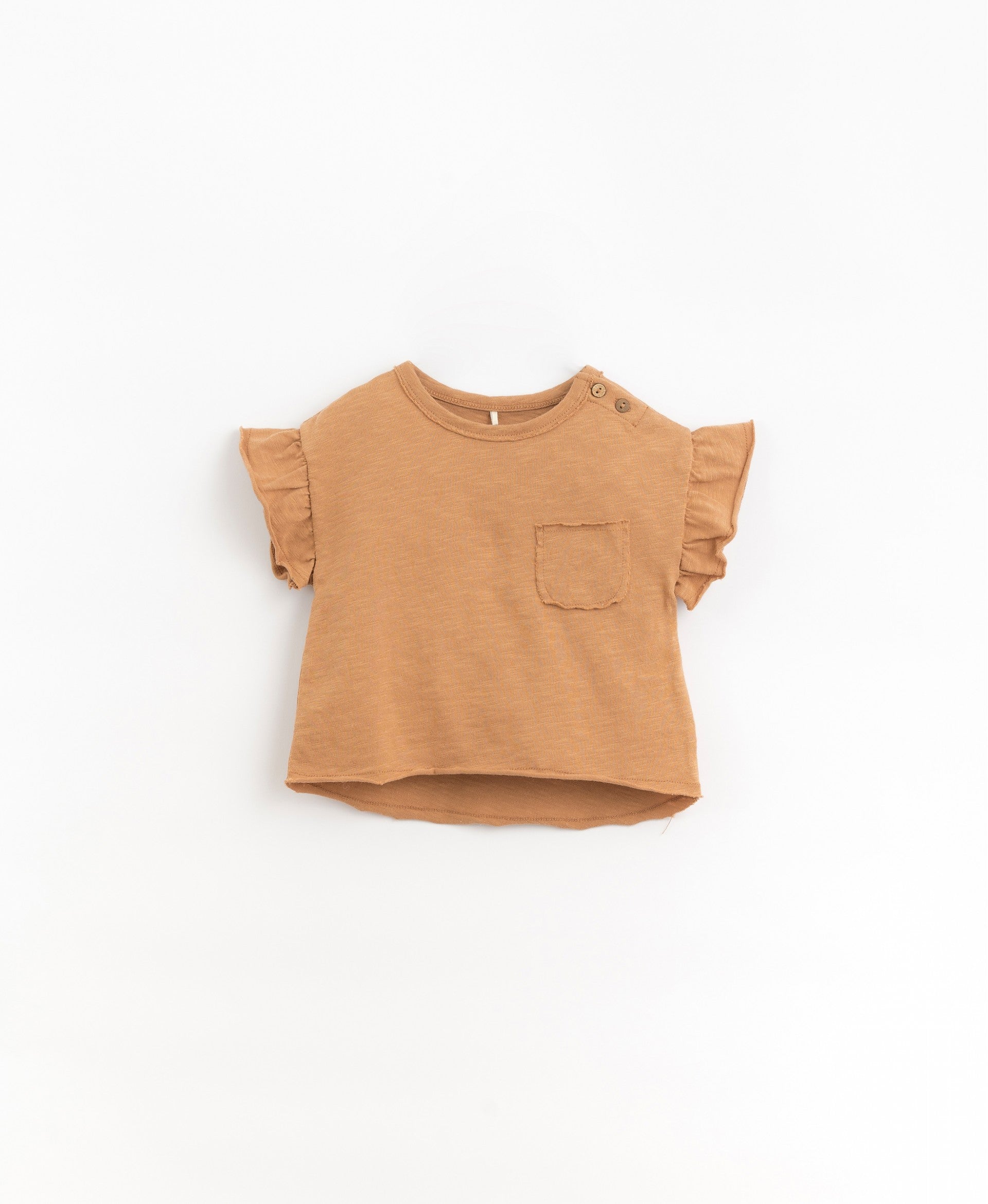 Ce tee-shirt fille en maille de coton biologique est proposé en couleur crème ou orangé. C'est un article disposant d'une encolure ronde et de manches courtes à petits volants, avec une ouverture sur l'épaule par des boutons en coco et une poche sur la poitrine. C'est l'incontournable du dressing de votre puce by Play Up.