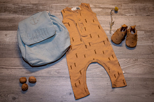 Parce que votre petit garçon a besoin de se sentir libre cet été, craquez pour notre assortiment combinaison légère, chausson et petit sac à dos personnalisé.