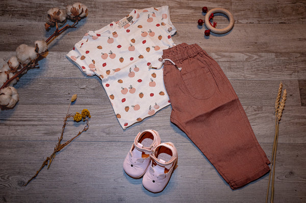 Pour les beaux jours, Vanille Coton mise sur le confort pour les petites filles. Découvre notre look complet avec tee-shirt, pantalon en lin et chaussures assorties.