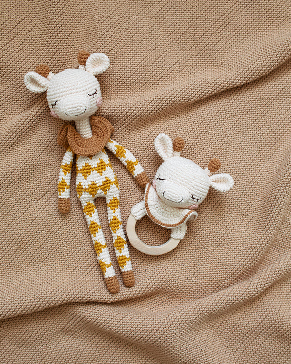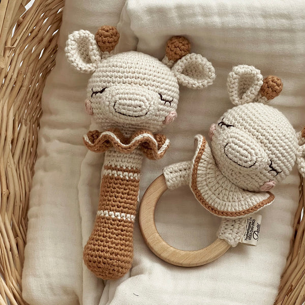 La texture unique du crochet en coton biologique stimule le toucher et apaise les gencives en période de poussées dentaires. Chaque pièce est soigneusement fabriquée à la main par des artisans talentueux, selon des méthodes traditionnelles, ce qui rend chaque girafe véritablement unique.