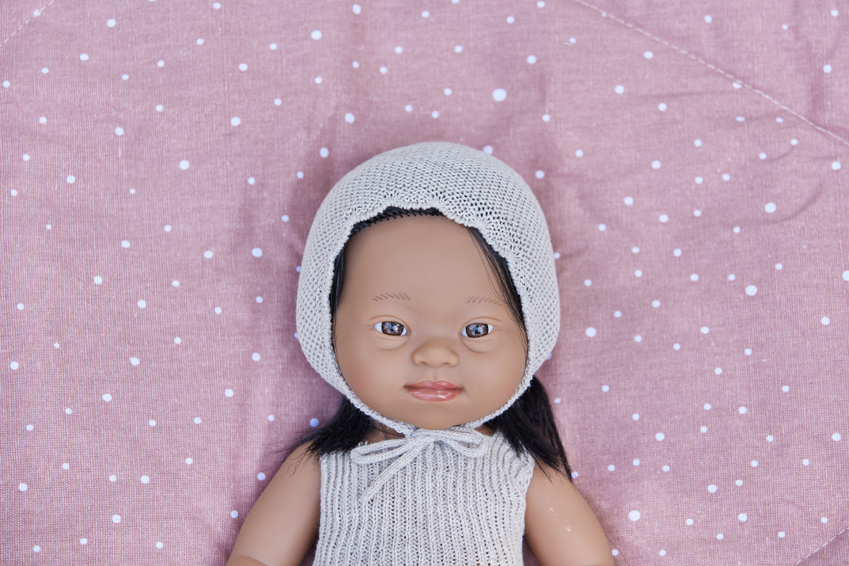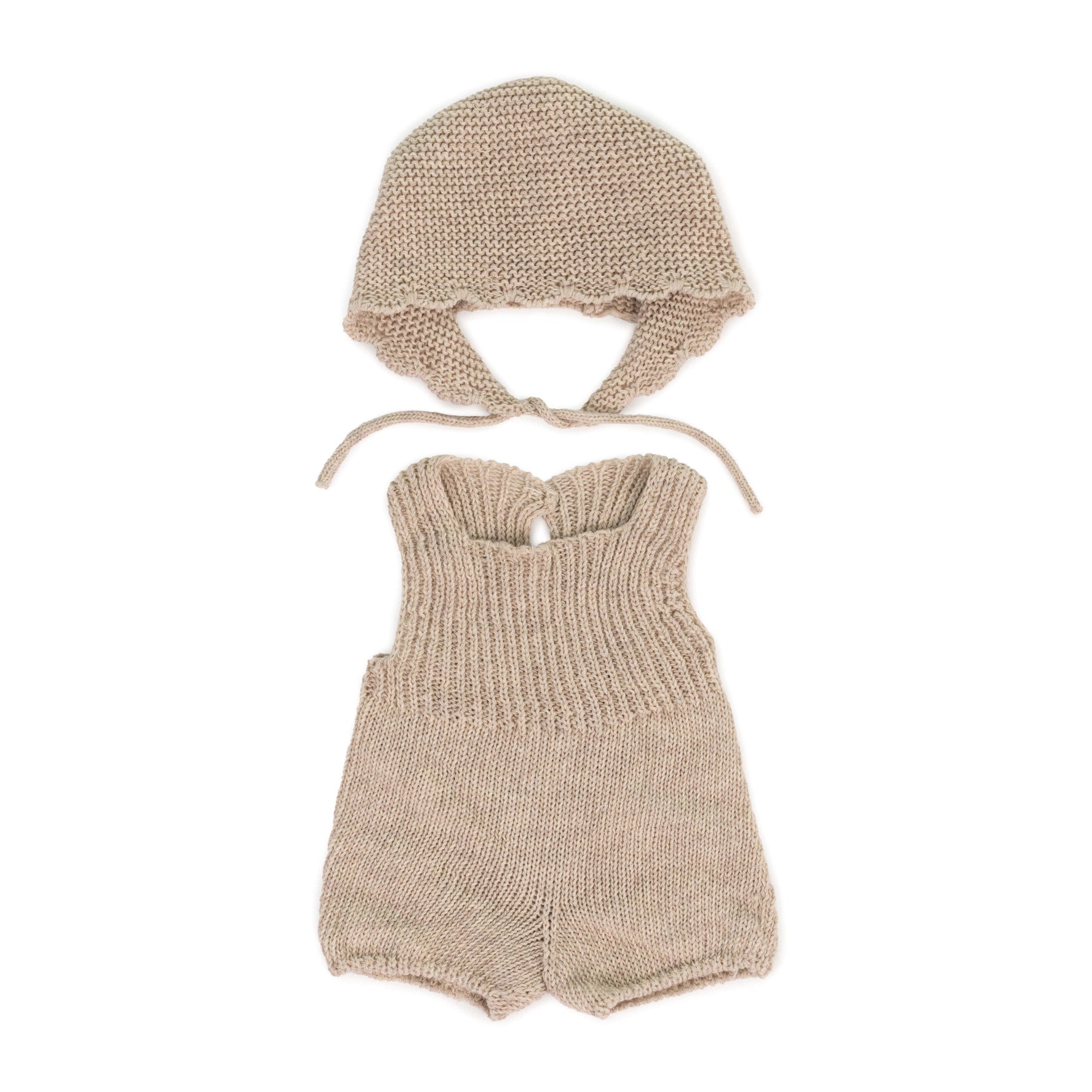 Vêtements pour poupées composés d’une barboteuse et d'un béguin en fibres recyclées.