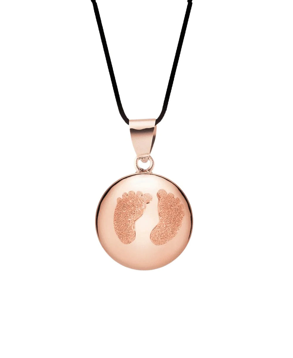 Ce joli pendentif est décoré de petits pieds en or fin rose : un avant-goût de ceux de votre bébé ! La décoration en poudre de diamant représentant des petits pieds de bébé est féminine et embellira votre ventre de femme enceinte.