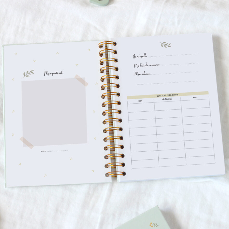 - Une double page de présentation de bébé et les contacts importants (médecins, crèche, nounou, parents...)