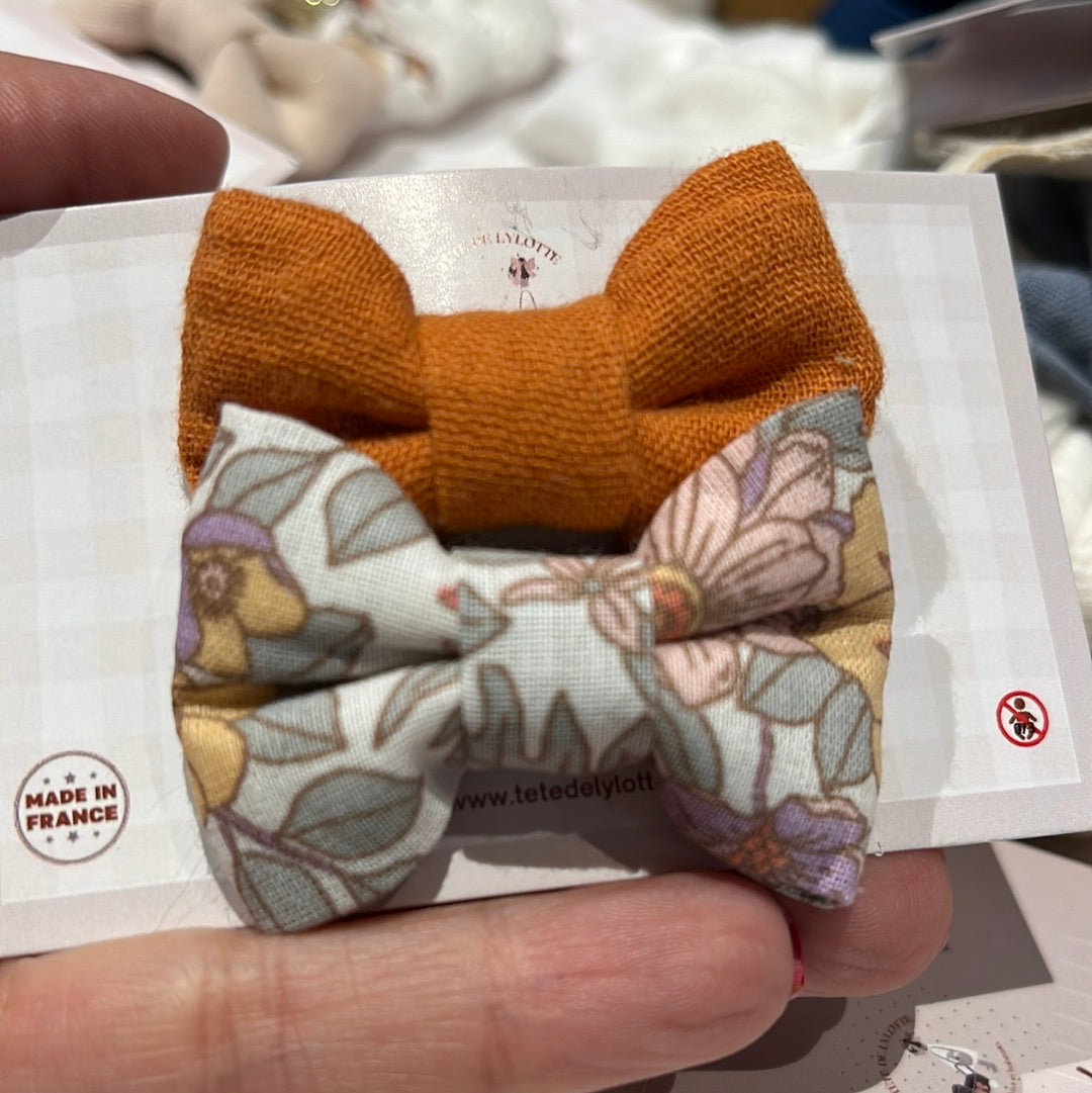 Barrette nœud en double gaze uni et fleurie, vendue en duo sur des pinces antiglisse.