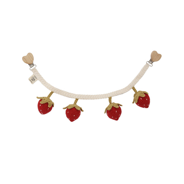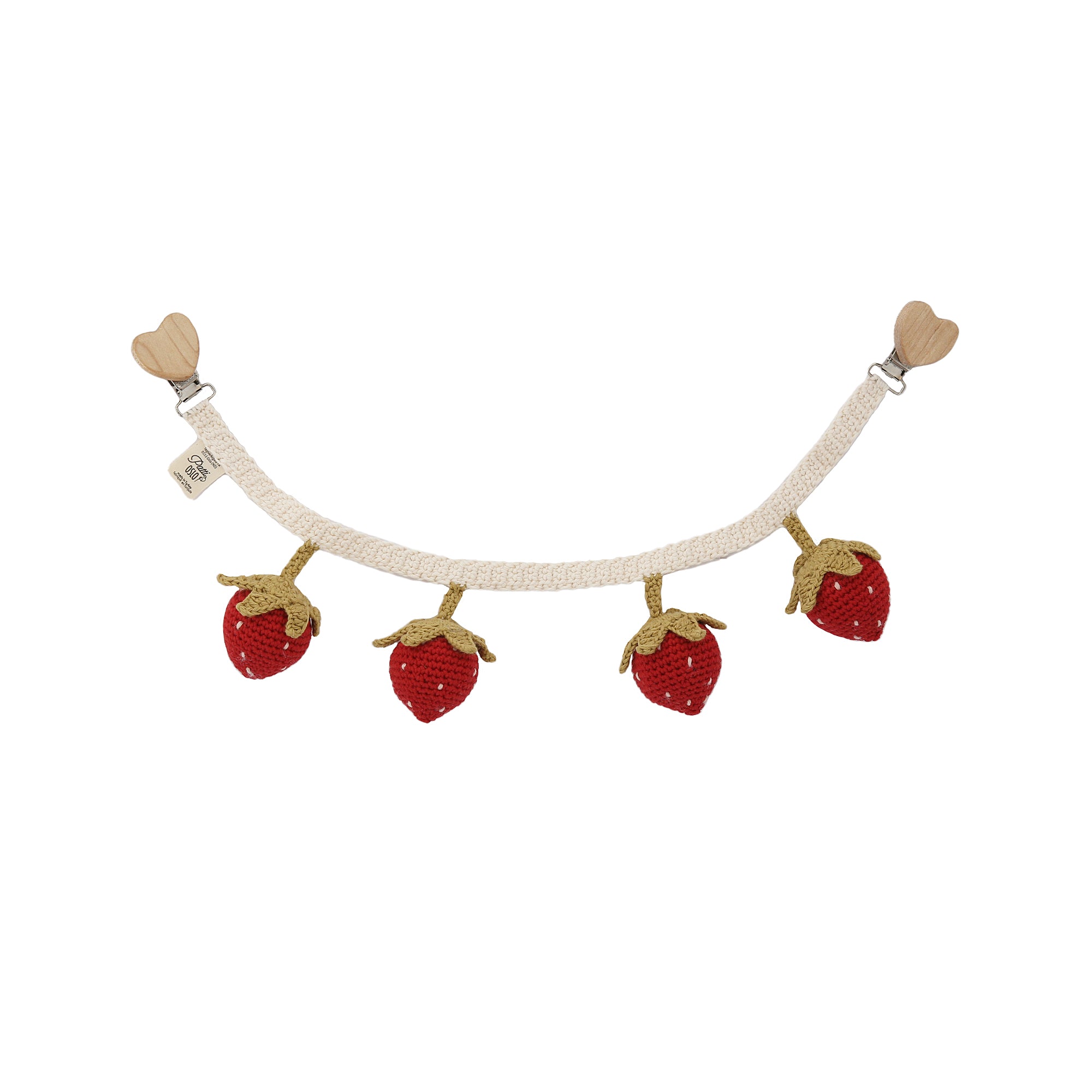 Douce comme un fruit cueilli au matin, cette chaîne de fraise invite votre bébé dans un univers féerique. Facile à attraper, elle stimule l’éveil grâce à ses formes, ses couleurs et ses sons délicats. Les adorables pinces en bois en forme de cœur permettent de l’attacher en toute sécurité à une poussette ou un cosy, pour l’avoir toujours à portée de main.