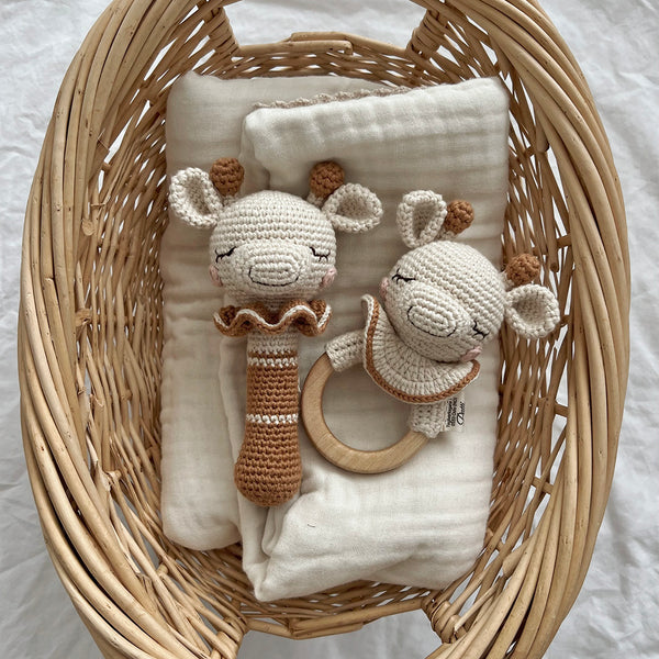 Découvrez notre adorable hochet girafe au crochet, confectionné avec soin dans une teinte caramel irrésistible. Parfait pour les petites mains curieuses, ce compagnon doux et léger stimule l'éveil de bébé tout en le divertissant. Ses formes arrondies et sa texture douce en font un jouet sûr et réconfortant. Idéal dès les premiers mois, ce hochet girafe ravira les parents en quête de jouets tendres et authentiques pour leur trésor.