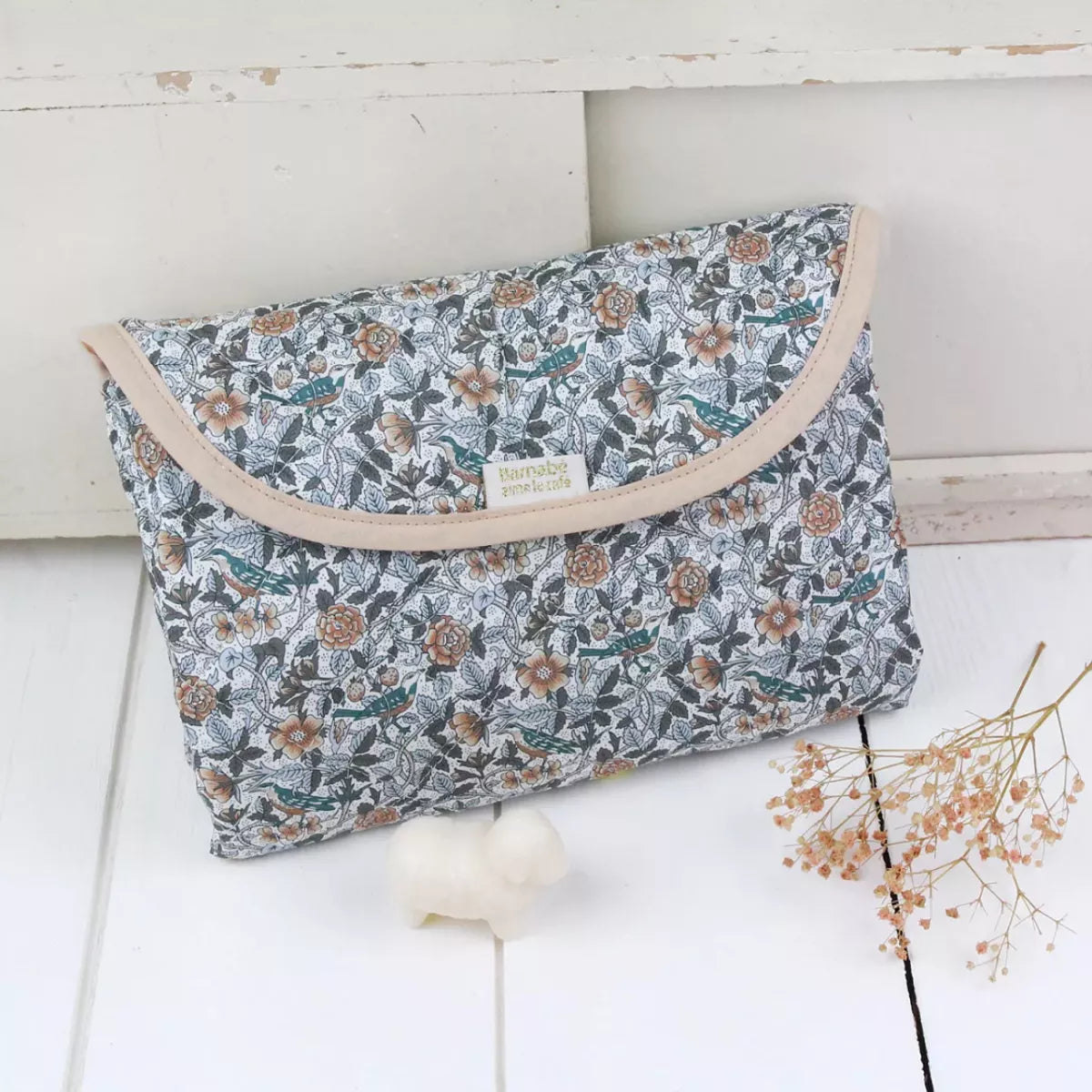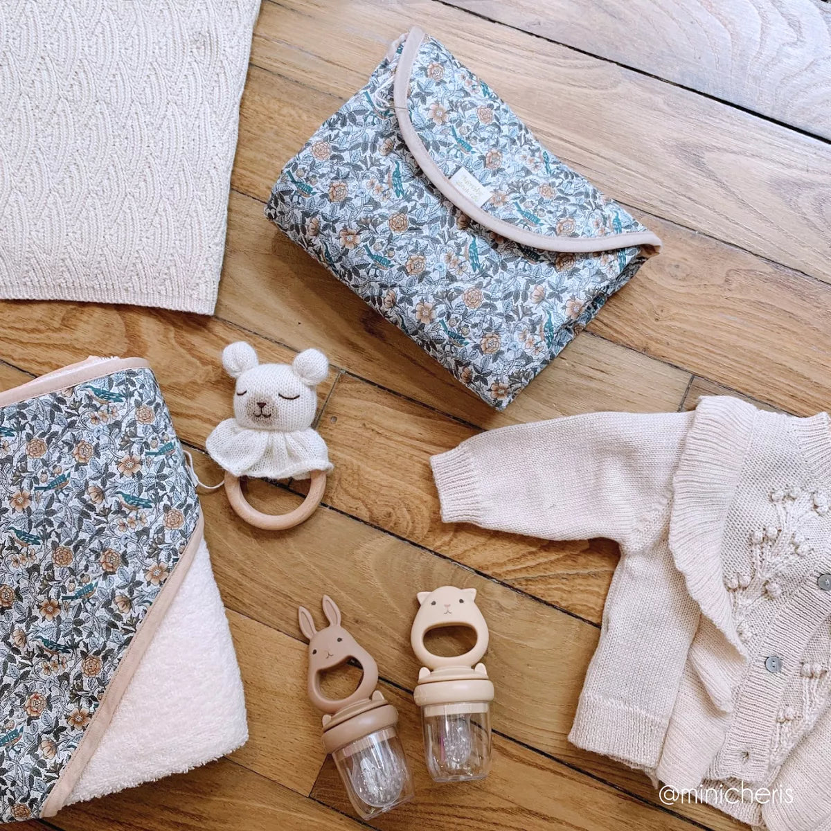Ce tapis de change nomade en tissu Liberty® molletonné, très pratique grâce à son intérieur plastifié.