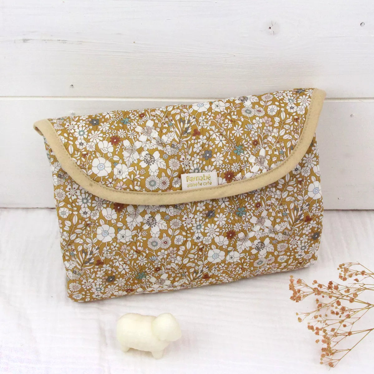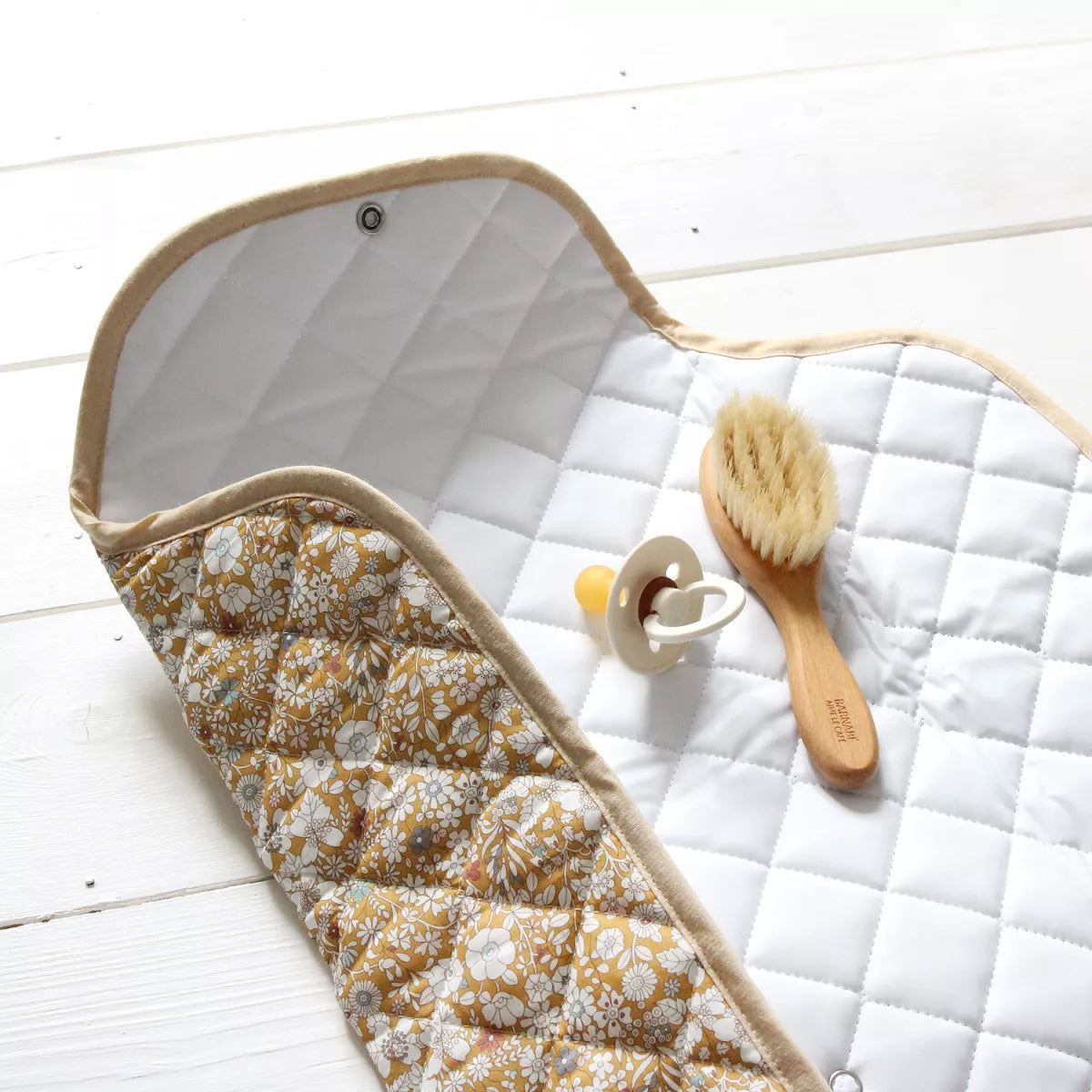 Ce tapis de change nomade en tissu Liberty® molletonné, très pratique grâce à son intérieur plastifié.