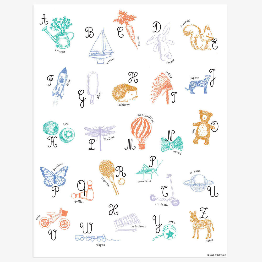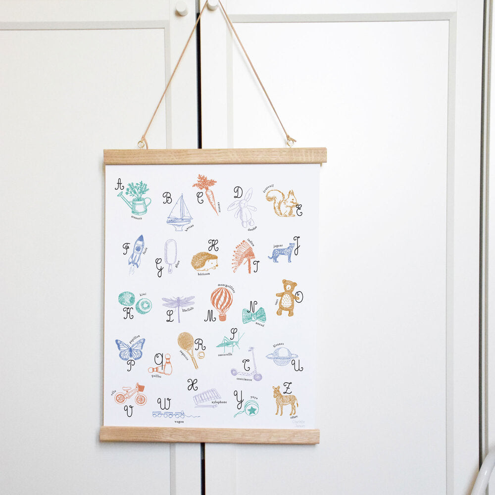 Apprendre en s’amusant, telle est la mission de cette affiche ludique et poétique. Tout l’univers de l’enfance est résumé en 26 lettres. C’est également un joli cadeau de naissance qui aura d’abord une vocation décorative avant de devenir utile quelques années plus tard…