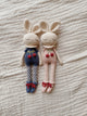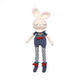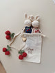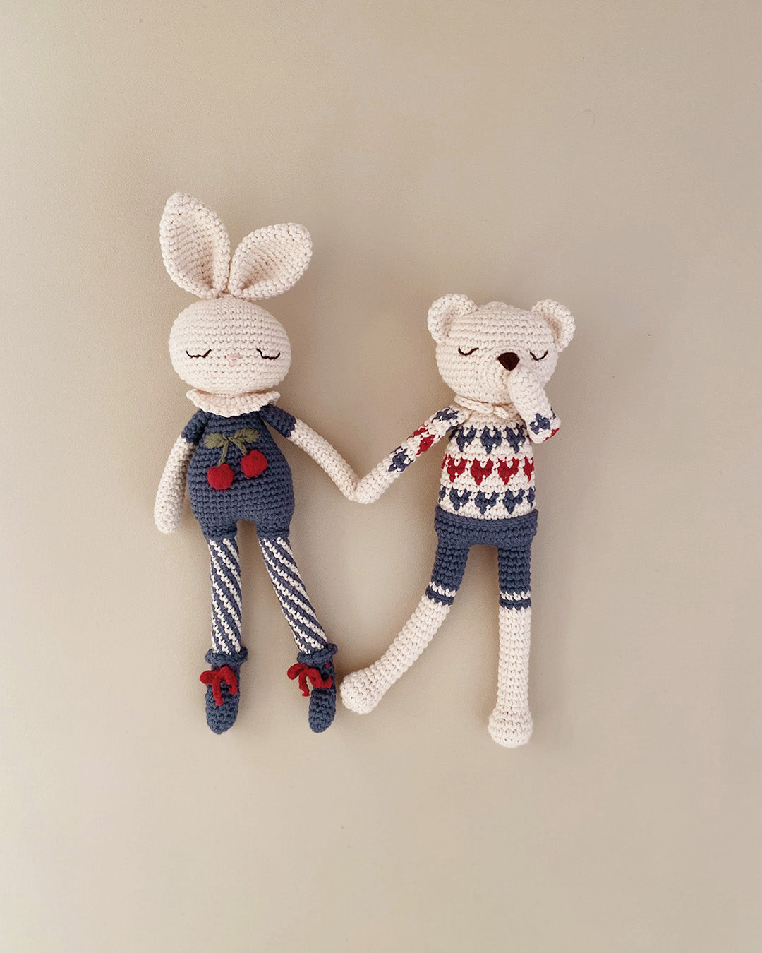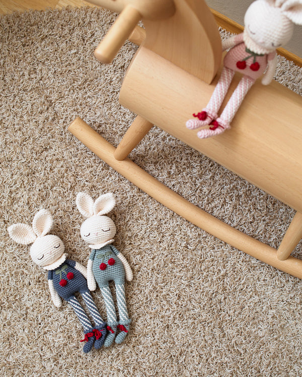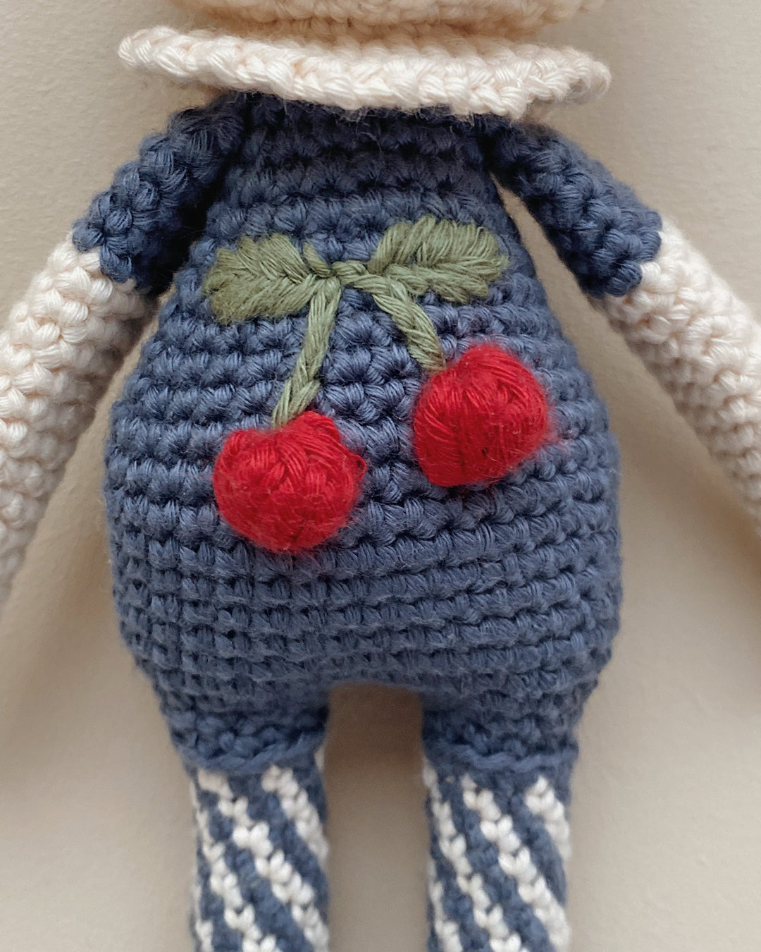 Avec sa frimousse paisible et ses longues oreilles toutes douces, ce lapin invite à la tendresse. Habillée d’une jolie combinaison bleu indigo ornée de deux cerises brodées à la main, elle évoque la fraîcheur d’un printemps en fleurs.