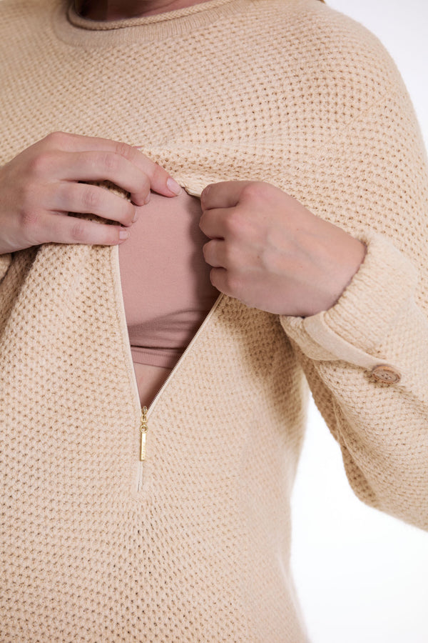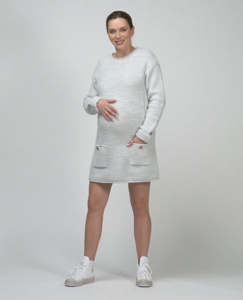 Fabriquée en Europe, la robe pull de grossesse et d’allaitement en maille à manches longues Honey est très douce et agréable à porter. Elle est composée de fils et boutons français, d’un col rond en maille côtelée, de manches à revers fixes et de 2 poches avant avec un bouton en bois d’olivier. La robe de maternité Honey dispose de 2 fermetures invisibles pour allaiter bébé en tout sérénité.