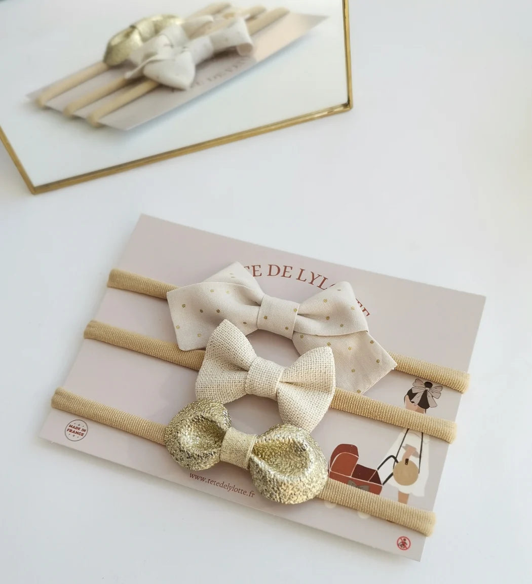 Vous craquerez pour ce trio de 3  petits nœuds en double gaze et coton dans des tons très doux.